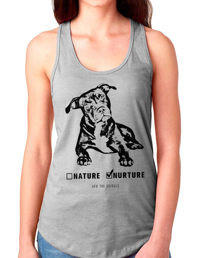 This super soft tank features our Nature vs. Nurture pit bull logo of the front in a monochrome print