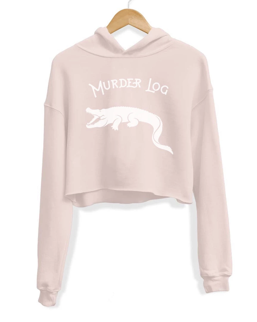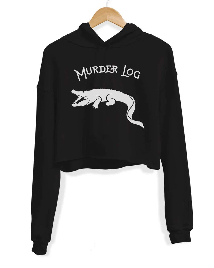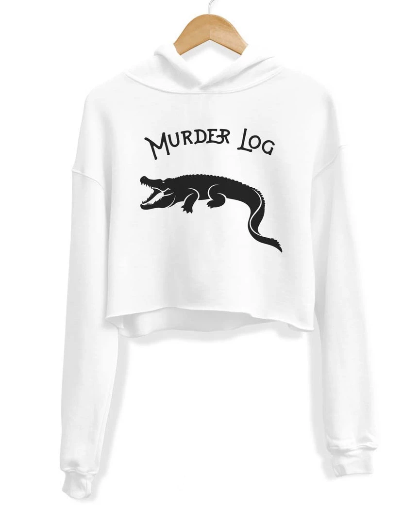 This soft and comfy crop hoodie is sure to be your new favorite with our Murder Log design on the front!