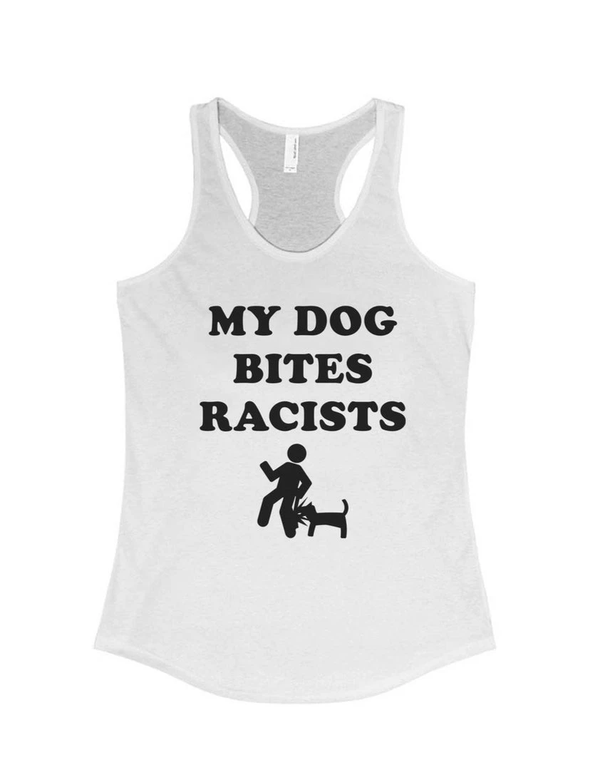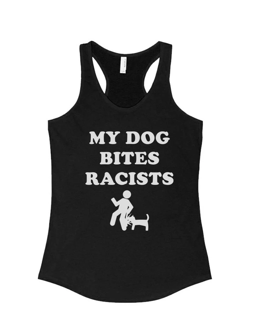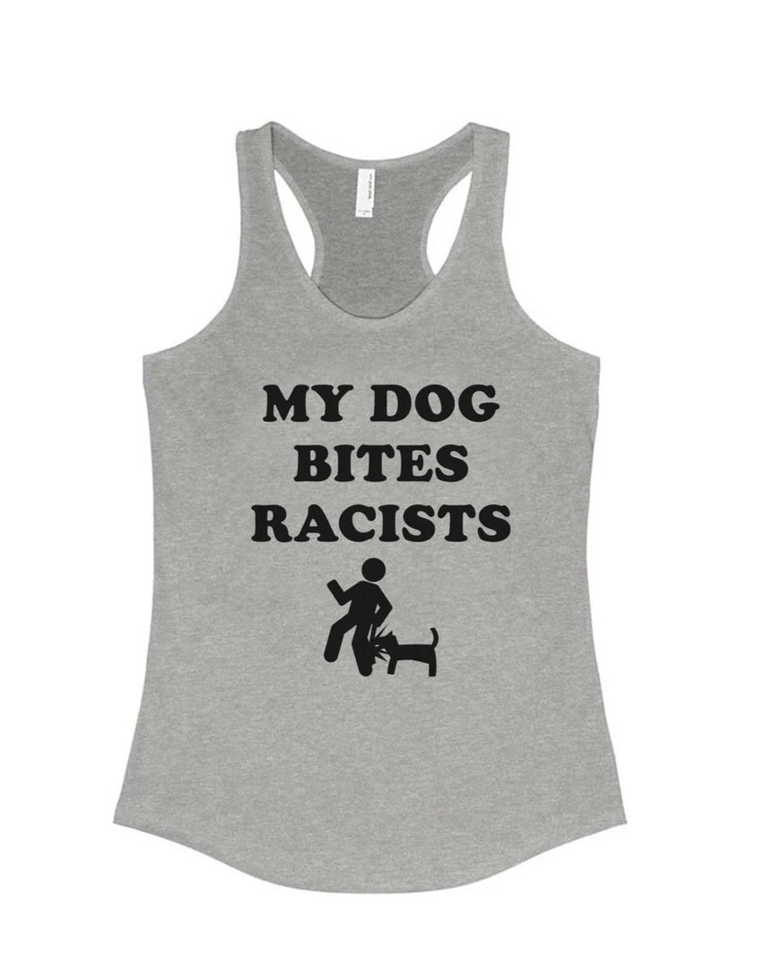 This super soft Racerback fashion tank features our “My Dog Bites Racists” design on the front!