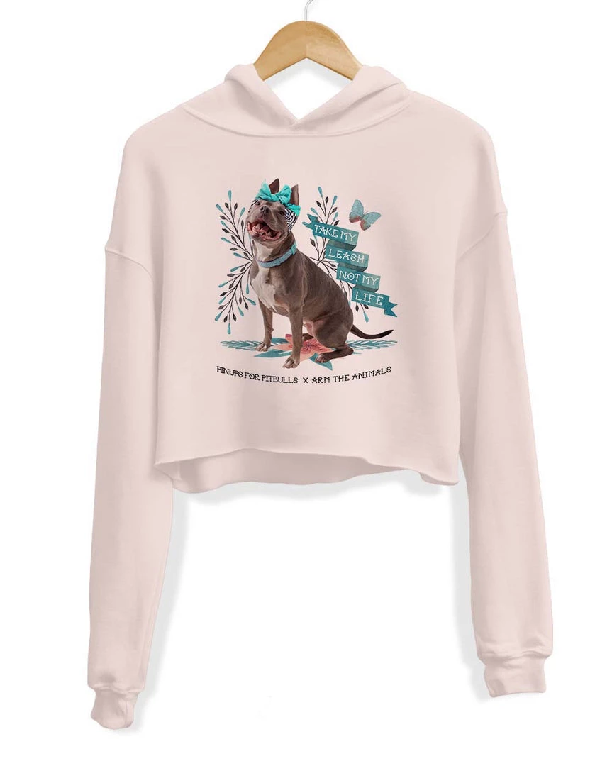 This soft and comfy crop hoodie features our colorful “Take My Leash Not My Life” design on the front!